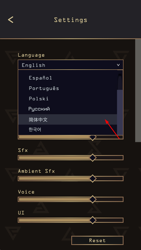 2、接着找到Language,点击English旁的箭头,下滑找到简体中文;