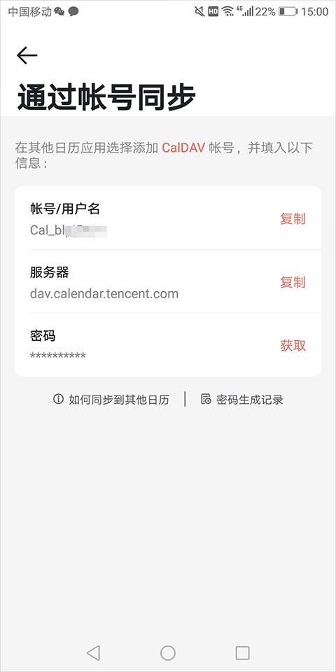 3、页面将显示账号相关信息,将这些信息复制到其他日历应用即可完成同步。