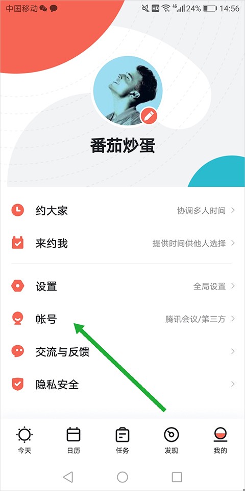 1、打开并登录腾讯日历APP,进入【我的】页面后,点击【帐号】选项。