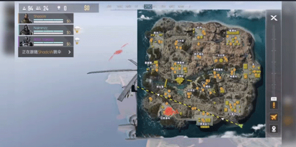 3、调整好后,玩家将同自己的三人小队,以及其他玩家乘坐同一架飞机到一个孤岛上进行大逃杀