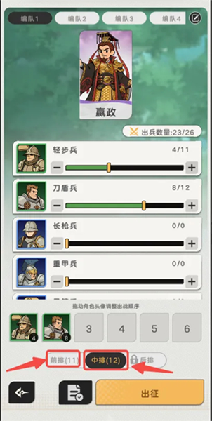 2、中排出战了12个兵,但刚进入战斗时,中排也只会显示4个兵,还有8个兵在后面替补(只有前面的兵死掉,才会补上去);