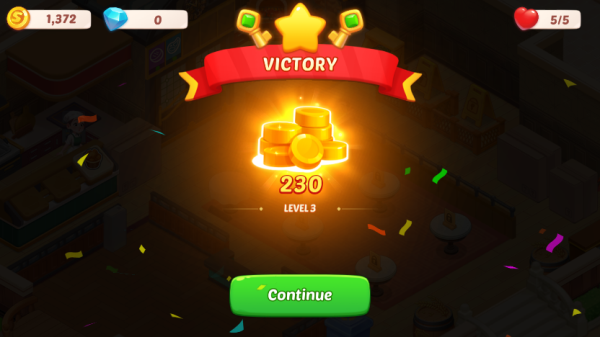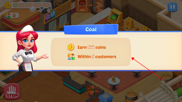 2、例如此关,需服务五位客人并获得144金币方可满星过关