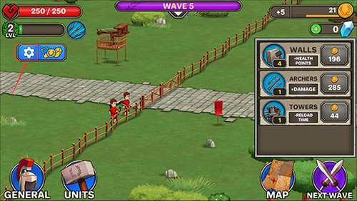 在这个模式里面,我们只能防御敌人的进攻而不能对敌人进行追击。只要我们把敌方士兵全部消灭了那就算胜利了。但是如果我们的城墙被敌方攻破之后,那么这一场战争就是失败了。每赢得一场战争,通过一关,我们都能够获得大量金币。所以,为了可以有效的抵御敌军的进攻,我们可以对以下三个方面进行升级。