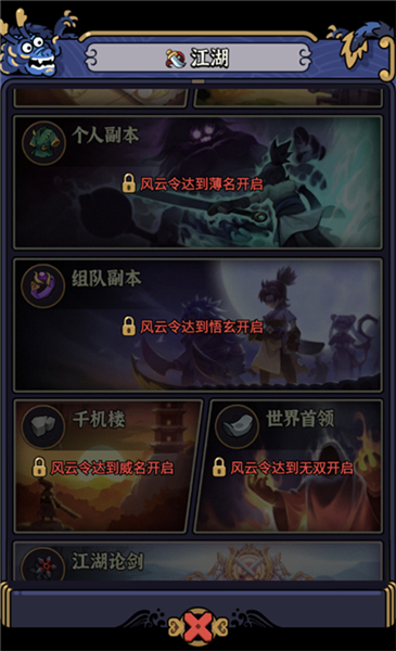 5、选择右侧的“江湖”入口即可挑战历练关卡,通关后能收获大量成长所需资源。