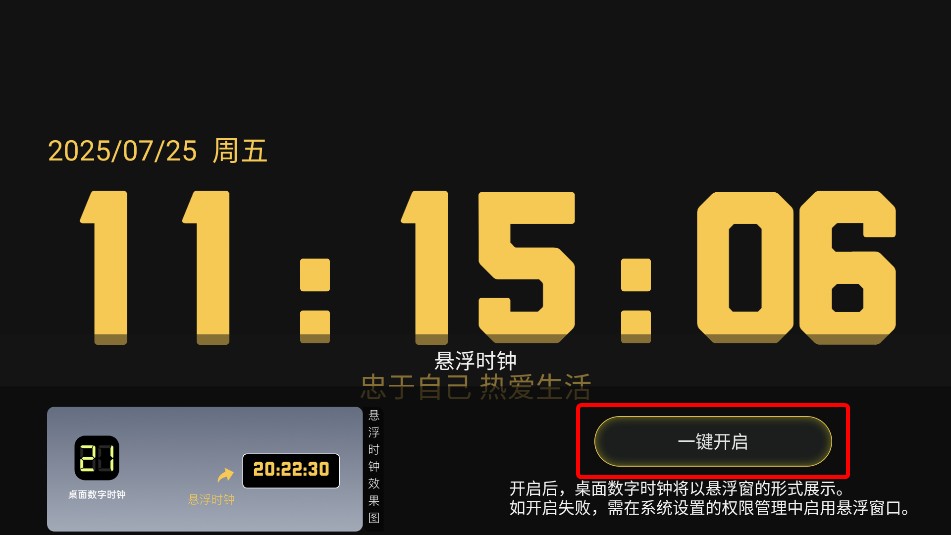 2、【悬浮时钟】悬浮窗可在任意界面显示时间,窗口大小支持自由调节。