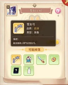 雪女弓是45级的装备,增加攻击和命中率,在急速风雪的雪女身上掉落,造型纤细华丽,雪白的颜色,形似水晶,深受女玩家的喜爱。