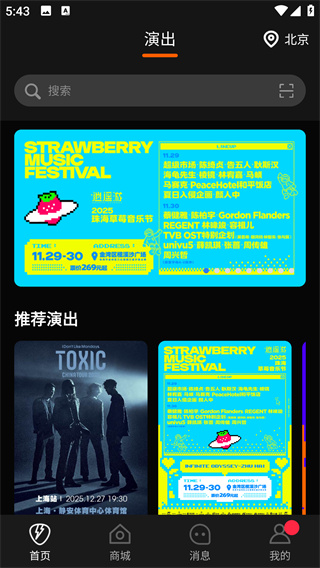 2、进入首页,有丰富的演出信息,有推荐演出也可以自己搜索想看的演出。
