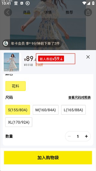 4、商品页面会显示折扣力度,选择合适尺码后,点击加入购物袋。