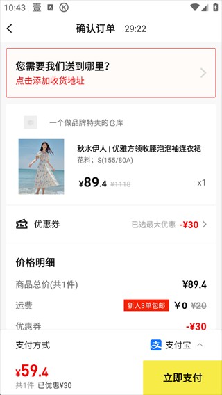 5、进入购物袋页面,填写收货地址,确认信息后完成支付即可。