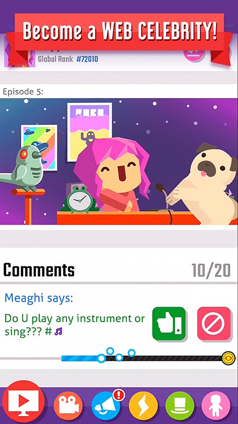 Vlogger Go Viral(主播养成)是一款模拟经营游戏,玩家化身网络博主,从零开始打造属于自己的频道,用轻松幽默的卡通画风呈现,结合真实的网红成长路径,体验从默默无闻到全球爆红的完整过程。
