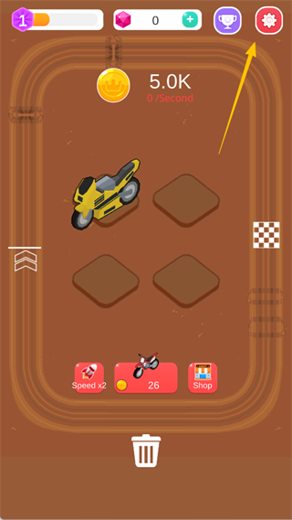 1、进入赛车大亨中文版游戏主界面,点击右上角的齿轮设置图标。