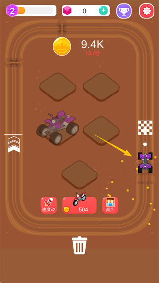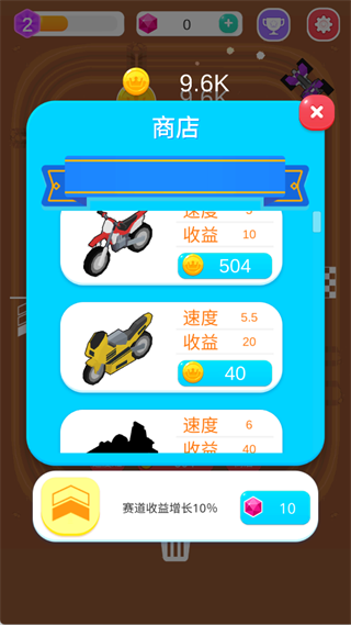 进入【商店】可以购买更高级的车辆,或使用宝石解锁赛道收益加成。