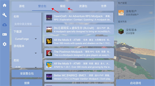 2、进入该界面后,可自由挑选各类整合包或模组,选择范围丰富。