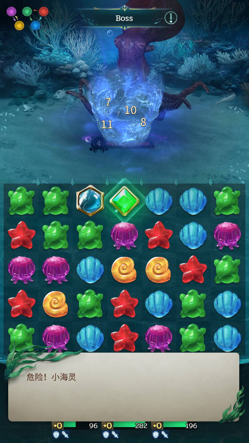 5、守关野生生物的血量条左侧会显示反击回合数,利用这个信息,你可以在敌人还未反击时进行有效的棋子消除。在空闲时间内多消除棋子,能够为你的海灵积攒双倍怒气,为接下来的攻击做好准备。