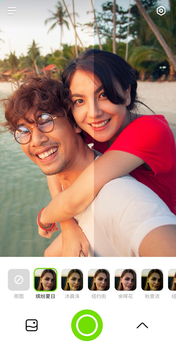 2、点击拍照功能进入相机界面,选择心仪的滤镜或贴纸后拍摄,照片效果实时呈现。