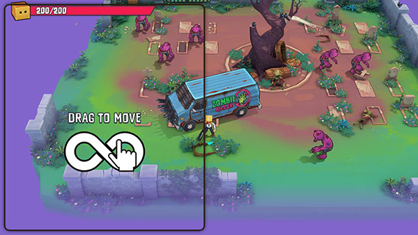 1、首先下载好本站带来的盒子头僵尸必须死,进入首页,开始教程,玩家通过左边滑动来控制角色的移动;