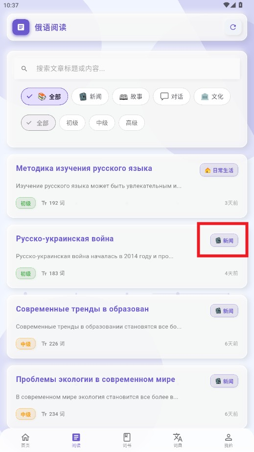 4、点击阅读功能进入对应板块,可浏览俄语新闻或生活类文章,辅助练习俄语阅读。
