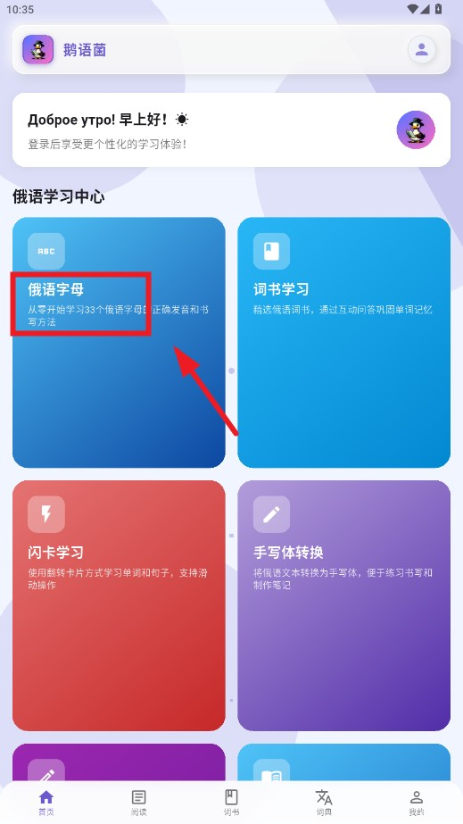 2、进入首页后,根据自身学习需求选择对应板块,比如点击“俄语字母”开启基础学习。