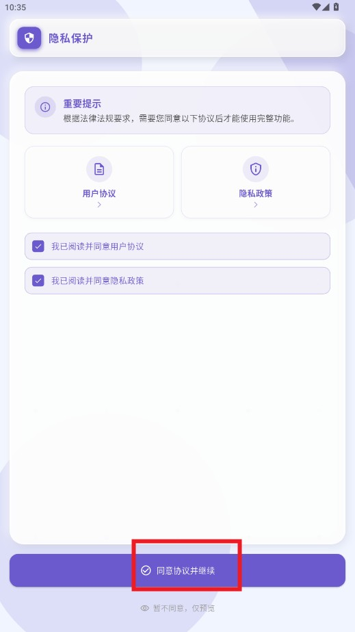 1、首次打开软件后,在提示界面点击同意相关使用协议,即可顺利进入应用主界面。