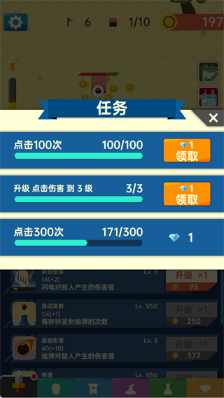 完成指定任务(如点击100次、升级点击伤害到3级)可领取钻石奖励,钻石用于解锁高级功能或购买道具。