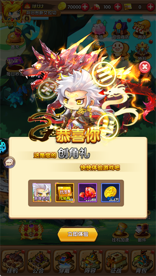 创建角色后即可直接领取丰厚奖励,包括菩提老祖英雄、2088钻石、303万金币等,这是前期最核心的启动资金和英雄,帮助你快速启动游戏进程。