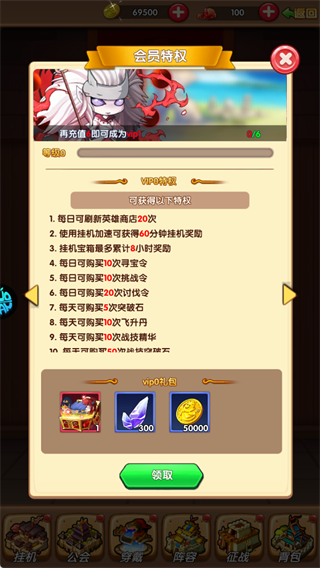 挂机时间越长,获得的奖励越多。VIP0玩家最多可累计8小时挂机奖励,记得定时上线领取。还可以使用「挂机加速」功能,一次性领取60分钟的挂机奖励,帮助你快速的清空积累的资源。