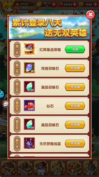 在累计登录8天的活动中,第一天即可获得红英雄选择箱,直接获取强力红卡;第二至第三天将获得传奇/高级召唤石,后续还有装备、召唤石等奖励,记得每天上线领取,不要错过。