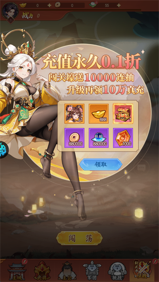 全场永久维持一折的超低折扣,648元的大礼包现在只要6块4毛8。首充更是夸张,0.01元就能拿到满星神将,开局直接起飞。月卡年卡同样享受一折待遇,这点钱几乎可以忽略不计。氪金门槛被拉到前所未有的低度,平民玩家也能轻松享受土豪级别的养成体验。花小钱办大事,说的就是这种。