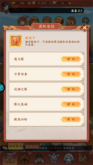 4、挑战副本掉落提现卡,可以在提现商店兑换代金券,代金券可以用于充值游戏内任意礼包。