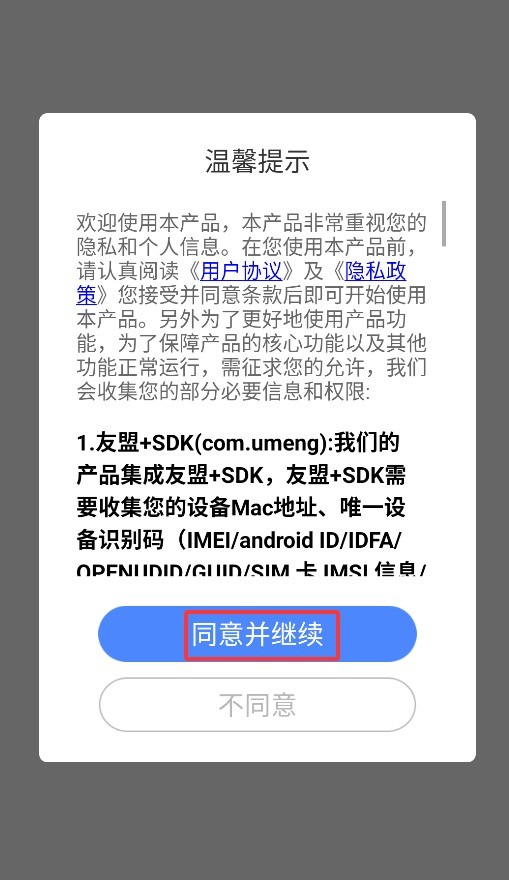1、首次启动APP时,需点击同意用户协议弹窗,方可进入主界面开启使用。