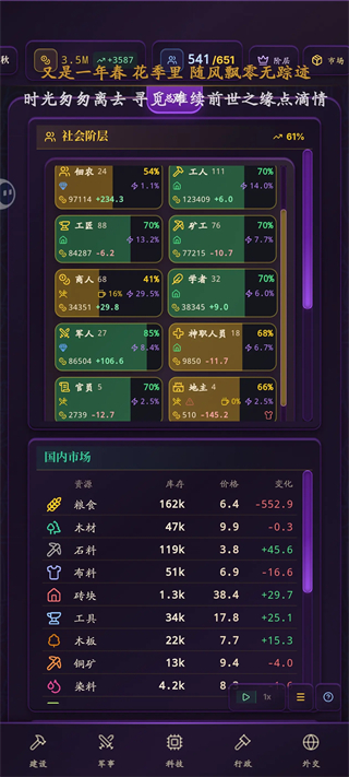 游戏的功能体系打磨得相当完善。供需关系不是摆设——粮食多了价格跌,铜矿少了价格涨,一条产业链的波动会顺着上下游传导。二十余种资源相互关联,十几类社会阶层各有诉求。市场经济的核心学问,都在这里了。想要玩得好,得懂点供需原理;想玩出花,得会预判价格走势。策略的深度,就藏在这些经济学问里。