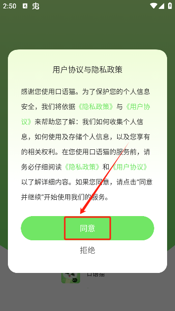 1、在对应站点下载安装口语猫app,首次使用需同意相关协议,方可进入软件。