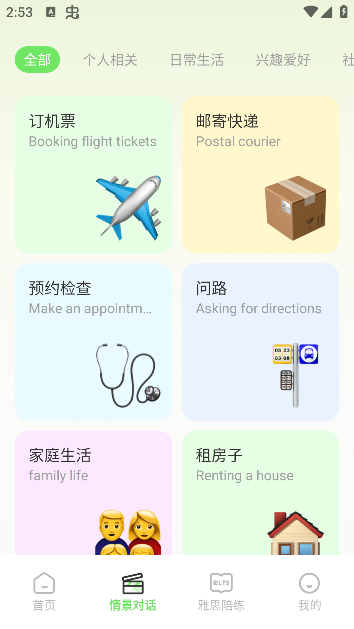 2、情景对话:支持多种场景下的对话练习,助力掌握实用英语语法与表达技巧。
