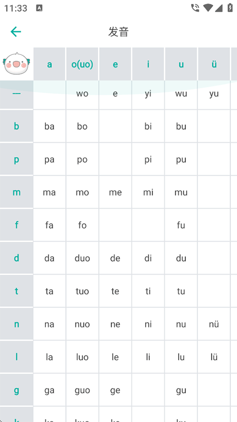 4、整合拼音字母表声母、韵母的发音图片及音频,从基础传授发音技巧,提供标准拼音字母表。