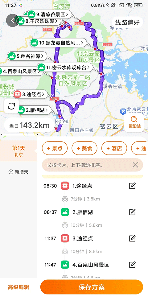 5、新增行程天数、编辑途经地点、拖动调整排序,完成后点击保存方案。