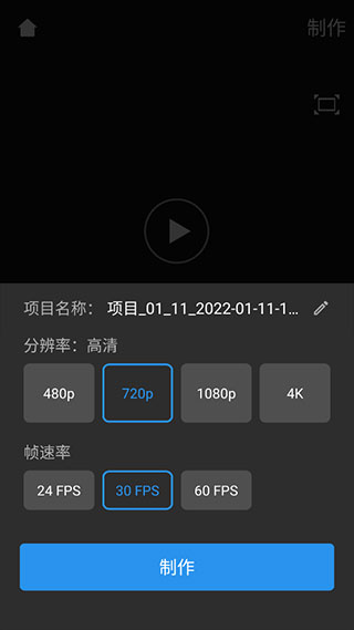 5、点击页面右上角的制作按钮,选择并设置视频的保存分辨率及FPS参数。