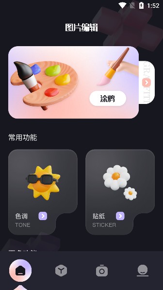 1、打开软件后,首先进入图片编辑板块,板块内陈列着各类丰富的编辑功能,一目了然。