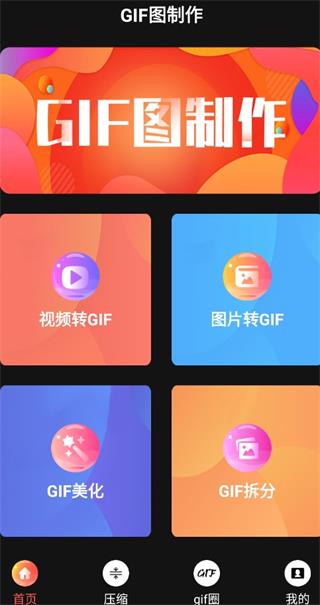 1、打开软件后,首页陈列着六大功能,分别是“视频转gif”“图片转gif”“gif美化”“gif拆分”“图片编辑”“免费证件照”。