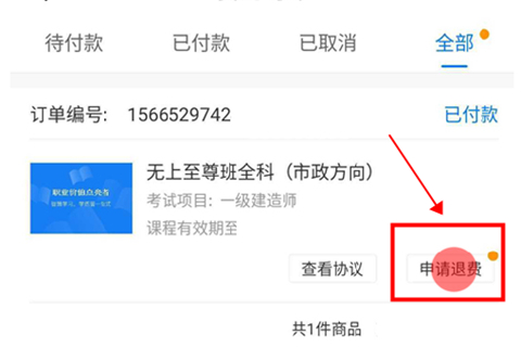 3、在订单列表中找到需要退费的订单,点击该订单右下方的【申请退费】按钮,按提示完整填写所有所需信息后提交申请。