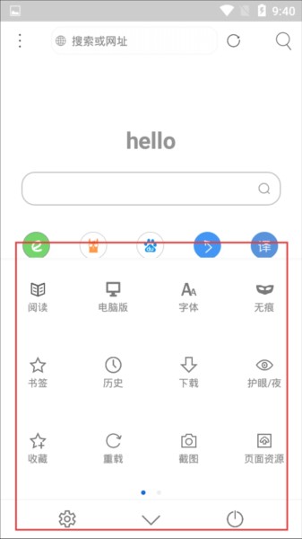 2、在首页点击相关图标,可唤出隐藏功能菜单,包含阅读模式可优化阅读体验,还能调整字体、开启无痕浏览,支持页面截图、查看页面资源。