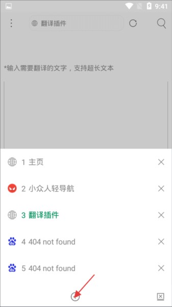 3、点击翻译进入翻译插件页面,可输入超长文本翻译,底部可查看当前打开的页面列表,点击加号可快速新建页面,方便同时浏览多个网页。