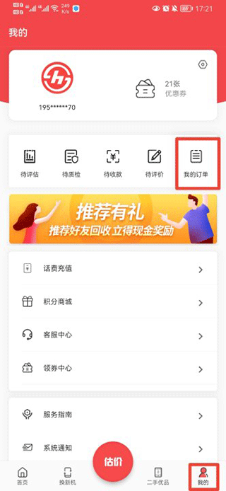 1、打开速回收软件,找到“我的”页面,点击进入我的订单。