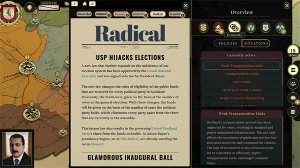 坐在椭圆形办公室里,桌上堆满文件。一份是减税提案,通过了企业高兴,但财政赤字会涨;一份是加税提案,通过了国库充盈,但民众会骂;一份是基建提案,通过了就业会升,但反对党会闹。你签一个字,经济就动一下;你改一个数,民生就变一下。玩家将扮演宗主国的领导者,需要在游戏中做出各种政治决策,如经济政策、外交政策、社会政策等。这些决策将直接影响国家的政治稳定、经济繁荣和社会秩序。笔在你手里,国在你笔下。