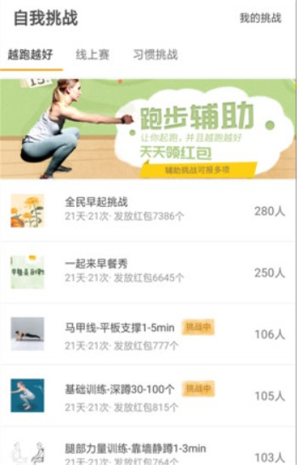 「21周挑战」:【21周跑步进阶】【21周练出马甲线】【21周告别亚健康】【21周练出天鹅颈】【21周早起早睡】【21周提高睡眠质量】等活动正在进行中,每个21周,都是一次改变。