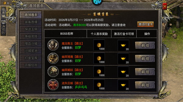 活动时间2026年3月27日-4月25日,首次击杀魔龙教主、幽冥猪魔等霸主BOSS,可领取1000传奇币奖励,激活打金卡还能额外领取20元宝,全服首杀玩家会公示在列表中。