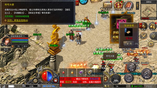 在盟重省找到「称号大使」NPC,收集烟花达人、玛雅殿主等神秘称号,可解锁额外打宝特权,完成对应任务还能领取100万海量经验值,助力快速升级。