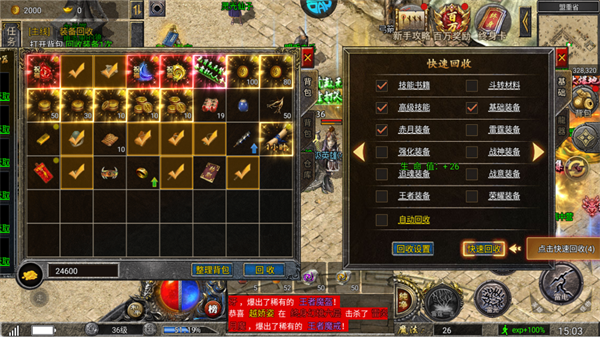 游戏支持快速回收功能,可勾选技能书籍、基础装备、赤月装备等类型一键回收换金币,还能自定义回收设置,清理背包同时获取养成资源,不浪费任何掉落。