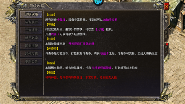 本服所有装备全靠打怪掉落,可上架拍卖交易;升级靠打怪,幻境挂机效率最高,开通终身卡可享额外经验加成;传奇币为通用货币,买收益卡后可交易换元宝,帝器、龍器等稀有道具可卖高价。