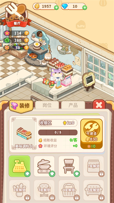 3、 产品研发系统:参与小游戏积累研发点,用于开发新商品或升级现有产品,丰富菜单以满足多样化需求。