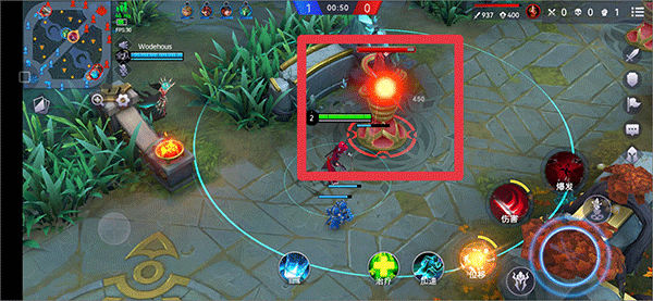 5、游戏开始时,通过左边屏幕控制英雄的移动,右边为普通攻击和专属技能,然后操控角色前往上中下路去带兵线并攻击敌方防御塔